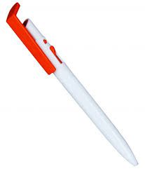Caneta plástica inteira branca com acionador colorido em relevo. Suporte do clip com dois furos em cada lateral e detalhe em relevo, possui anel “vazado” abaixo do clip e detalhes na parte inferior em relevo.